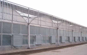 兩側(cè)安裝濕簾風(fēng)機(jī)降溫系統(tǒng),可有效降低棚內(nèi)溫度