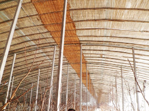冬暖式拱型溫室是在大跨度立柱拱棚的基礎(chǔ)上進(jìn)一步改進(jìn)其保溫性,棚面覆蓋草苫或棉被,可提高冬季棚內(nèi)溫度,種植葡萄、櫻桃等水果作物,可提前上市。